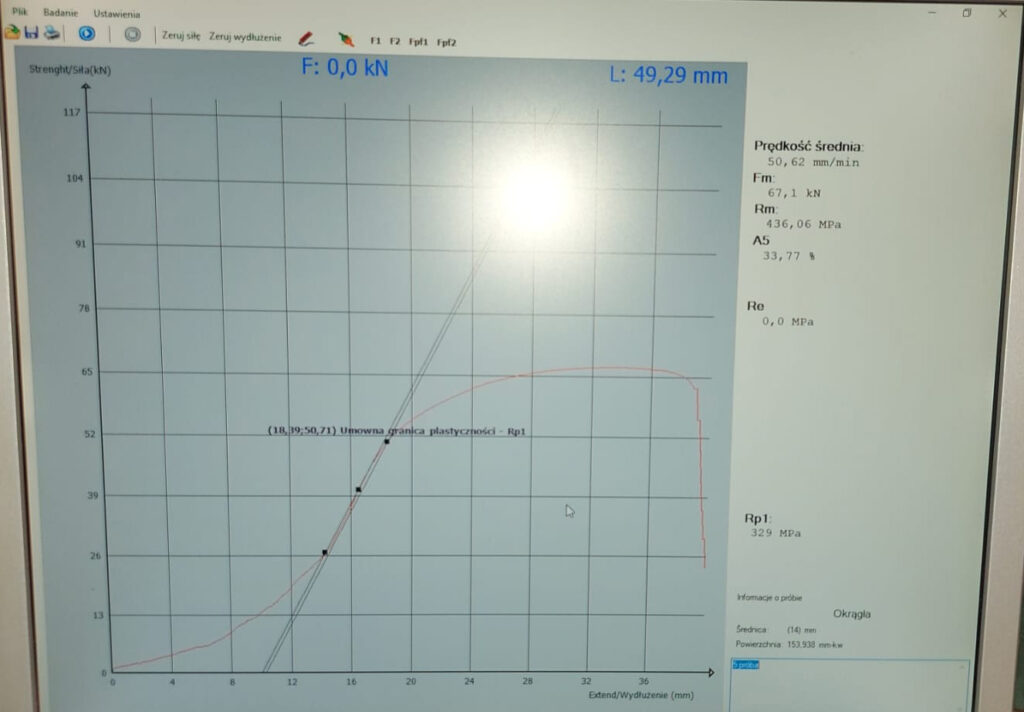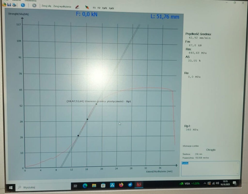 W dniu 16 października 2025 r. przeprowadzono serię badań wytrzymałościowych próbki materiału o przekroju okrągłym i średnicy 14 mm. Test wykonano w oprogramowaniu TestMaster, uzyskując szczegółowe dane dotyczące właściwości mechanicznych badanego materiału.